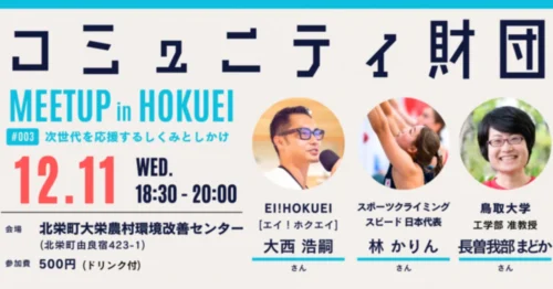 今回は、北栄町で行われたコミュニティ財団ミートアップイベントのレポートとして、「エイ!ホクエイ」の若者を応援する仕掛けのお話や、日本代表スポーツ選手をとりまく現状、そこから見えてくる若者支援の可能性についてまとめました。